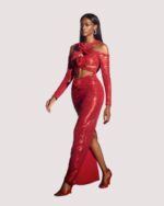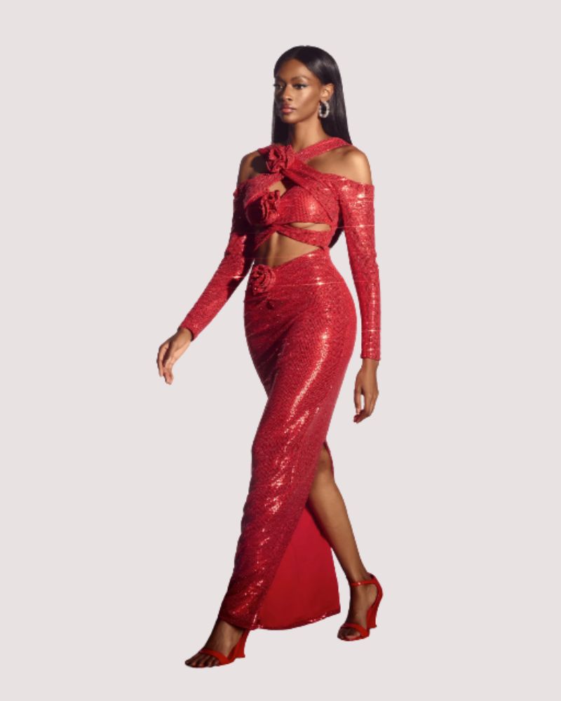 Turn heads and own the spotlight in The Jessica Dress — a statement gown made for women who command attention. Drenched in crimson sequins, this figure-skimming silhouette features a dramatic cut-out bodice, delicately held together by handcrafted rosette appliqués. The asymmetric off-shoulder design adds a sultry twist, while the high-waisted drape cascades into a floor-length finish, elongating the frame with every step.
